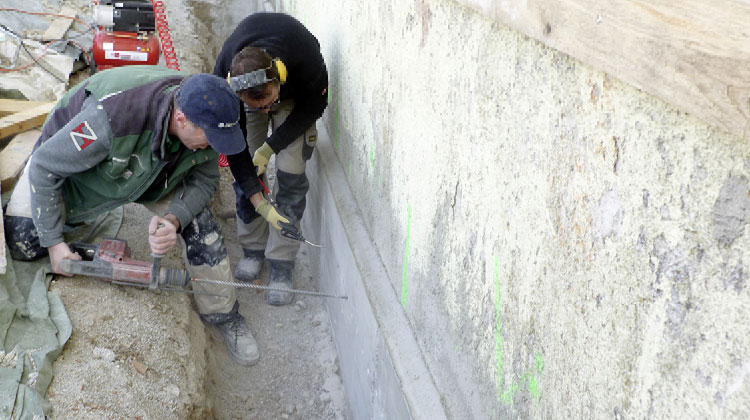Abschnittsweises unterfangen / gründen einschließlich dem Einbau einer horizontalen Feuchtigkeitssperre und kraftschlüssig Ausmauern zu dem Bestandsmauerwerk